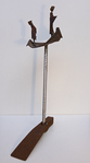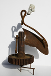2017Het figuur in dit beeld zit op de restanten van een antiek fietszadel. Het linker been is een gedroogde duivenpoot. Tijdens het uitgraven vond ik duif en zadel in de zelfde sloot